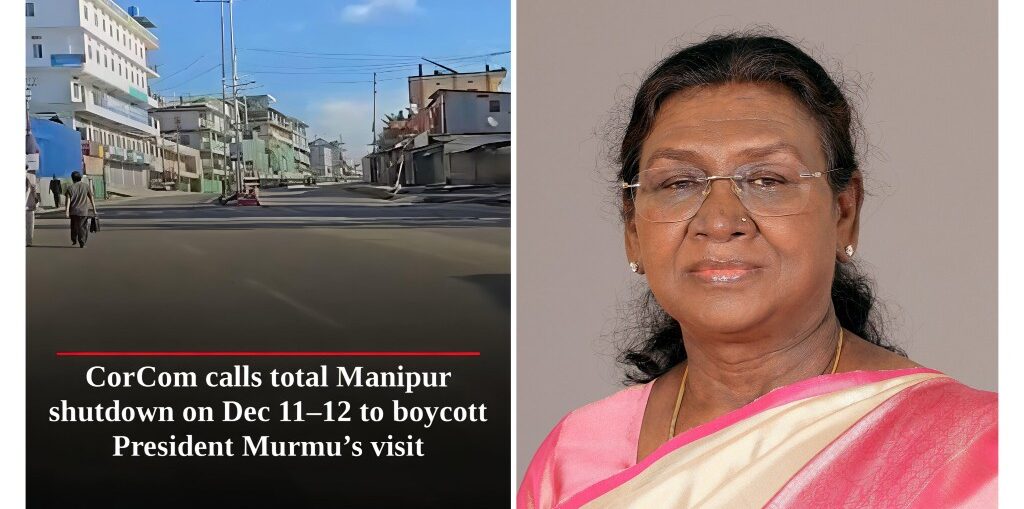 CorCom Declares Shutdown, Calls for Boycott Amid President Murmu’s Upcoming Manipur Visit Featured NE News Regional Beat by Akanksha - December 10, 20250 The Coordination Committee (CorCom), a coalition of banned insurgent groups operating in Manipur, has announced a statewide shutdown coinciding with the scheduled visit of President Droupadi Murmu on December 11 and 12. The shutdown is set to begin at 1:00 pm on December 11 and will remain in effect for