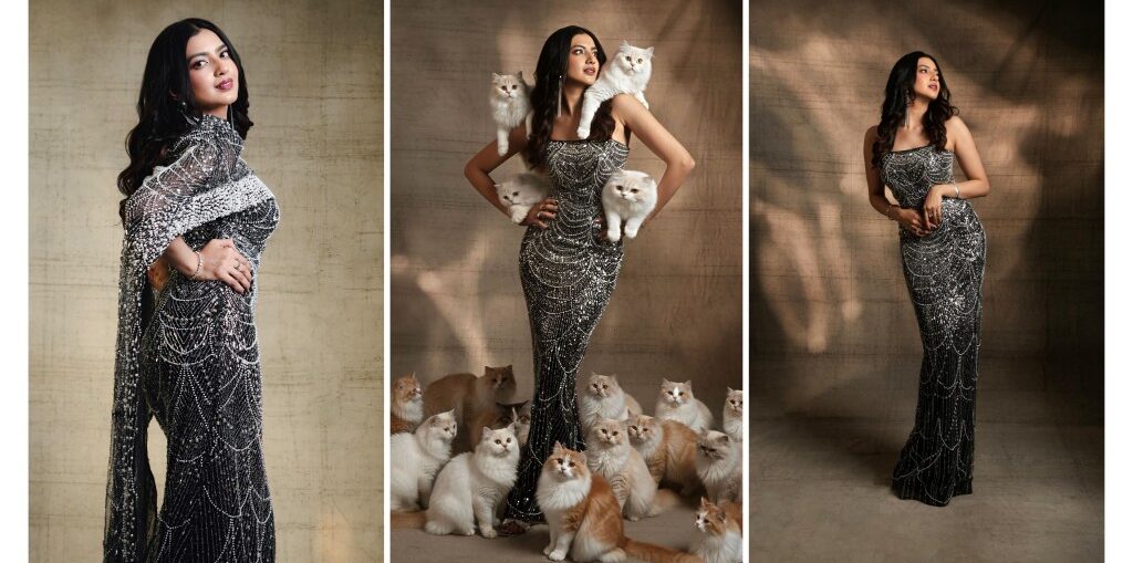 Kashika Kapoor Radiates Old-Hollywood Glamour in a Dazzling Hand-Embroidered Gown Featured Funtainment by Akanksha - December 3, 20250 There are moments when fashion stops being fabric and embellishment and becomes pure storytelling — and Kashika Kapoor’s latest look is exactly that kind of moment.Stepping into a breathtaking black gown drenched in intricate silver beadwork, Kashika channels an ethereal blend of Old-Hollywood elegance and contemporary stardust. The silhouette, sculpted to perfection, traces her frame like liquid light, creating a visual rhythm of cascading patterns that sparkle with every breath she takes. Each photograph feels like a frame from a timeless film — poised, powerful, and impossibly graceful.What elevates this look even further is Kashika’s presence. She doesn’t merely wear the gown; she animates it. With her arms rising in a soft, balletic motion and her chin tilted toward the light, she transforms the space around her into a stage. The soft curls, understated yet luxurious jewellery, and the subtle glow of her makeup together create an aesthetic that is equal parts classic and cosmic.And then comes the most heart-melting twist — the frame where a circle of cream-coloured puppies surrounds her like she is their moon. It’s rare to see opulence and innocence blend so seamlessly, but Kashika carries both with an ease that’s uniquely hers. The contrast between the high-glam gown and the soft playfulness of the puppies creates an image that is instantly iconic — the kind that lingers long after you’ve scrolled past it.Kashika has always been known for bringing emotion into her fashion moments, but this shoot feels like a celebration of her evolution — a star who knows exactly how to balance elegance with warmth, glamour with soul. This look is not just a couture statement; it’s a reminder of why she captivates wherever she goes: she embodies magic without ever losing her authenticity.With every project, every appearance, every frame, Kashika Kapoor continues to carve her own narrative — one shimmering gown and one unforgettable moment at a time. Share this: Click to share on Facebook (Opens in new window) Facebook Click to share on X (Opens in new window) X Click to share on Pinterest (Opens in new window) Pinterest Click to share on Telegram (Opens in new window) Telegram Click to share on WhatsApp (Opens in new window) WhatsApp Like this:Like Loading... Related