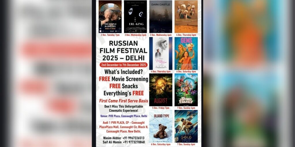 Russian Film Festival 2025 Returns to Delhi With a Grand Celebration of World Cinema Featured Funtainment by Akanksha - November 28, 20250 December 2–7, 2025 | PVR Plaza, Connaught Place | Delhi is set to host one of the most anticipated international cinema festivals of the year as the Russian Film Festival 2025 returns with a richer, grander, and more diverse edition. Scheduled from December 2 to 7, 2025, at PVR Plaza, Connaught Place, promising an unforgettable cinematic celebration for all.This year’s line-up features a curated selection of award-winning films from Russia, Belarus, Serbia, Turkmenistan, Uzbekistan, and Kyrgyzstan, showcasing an exceptional mix of cultures and storytelling styles. All films will be screened in their original languages with English subtitles for the convenience of Indian audiences.Adding to the excitement, popular Russian actors Kirill Kuznetsov (August) and Irina Pautova (Rowing for Gold) are expected to attend, interact with fans, and participate in red carpet moments.—🎬 FESTIVAL SCHEDULE – Russian Film Festival 2025 (Delhi)Venue: PVR Plaza, Connaught Place —📅 2 December 2025 – Tuesday06:30 PM – 07:00 PM• Opening Ceremony – Part 107:00 PM – 08:50 PM• Two People in One Life and a Dog08:50 PM – 09:10 PM• Q&A Session—📅 3 December 2025 – Wednesday04:00 PM – 05:40 PM• The Erl-King• Followed by Q&A06:00 PM – 08:30 PM• Dark Castle• Followed by Q&A—📅 4 December 2025 – Thursday04:00 PM – 05:50 PM• Magtymguly Pyragy• Followed by Q&A06:00 PM – 07:50 PM• A Dance With Mom• Followed by Q&A—📅 5 December 2025 – Friday06:30 PM – 07:00 PM• Opening Ceremony – Part 207:00 PM – 09:20 PM• August09:20 PM – 09:40 PM• Q&A Session—📅 6 December 2025 – Saturday04:00 PM – 05:50 PM• Blood Type• Followed by Q&A06:00 PM – 07:50 PM• GEMS• Followed by Q&A—📅 7 December 2025 – Sunday04:00 PM – 05:45 PM• The Dino Family• Followed by Q&A06:00 PM – 07:50 PM• Rowing for Gold• Followed by Q&A—Festival AttractionsInternational Movie ScreeningsInteraction with Actors & FilmmakersInfluencer and Photo ZonesRed Carpet MomentsTickets available on Paytm and BookMyShow.—Russian Film Festival 2025 – DelhiCelebrating Cinema, Culture & Friendship Share this: Click to share on Facebook (Opens in new window) Facebook Click to share on X (Opens in new window) X Click to share on Pinterest (Opens in new window) Pinterest Click to share on Telegram (Opens in new window) Telegram Click to share on WhatsApp (Opens in new window) WhatsApp Like this:Like Loading... Related